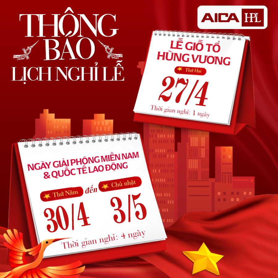 AICA HPL kính chúc Quý đối tác và Quý khách hàng một kỳ nghỉ lễ an nhiên, hạnh phúc bên gia đình. Mọi yêu cầu hỗ trợ gấp trong kỳ nghỉ, vui lòng liên hệ Hotline hoặc nhắn tin trực tiếp cho Fanpage.